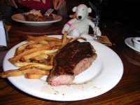 | Paddy with a Caramel Frappacino at Starbucks | Paddy's Pub opposite the steakhouse | Paddy with a "New York Strip" at the steakhouse) |