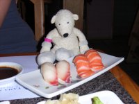 | Paddy eating a Pepperoni Pizza Pretzel | Paddy eating a slice of Kahlua Coffee Chocolate Cheesecake at the Cheesecake Factory | Paddy eating sushi at a Sushi Bar |
