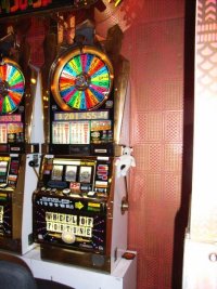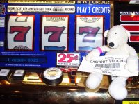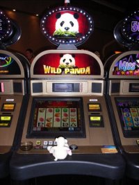 | Paddy trying his luck in the slot machines | Paddy with his winnings on the slot machines. Gambled $2 and won $20 | Paddy checking out the "Wild Panda" |