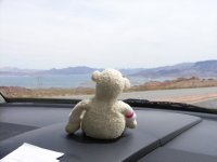 Paddy looking at the car at Lake Mead |